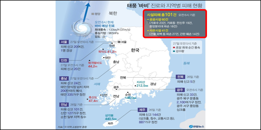 이외에도 열차 운행 일부 중단 등 일시적으로 하늘길과 뱃길 통제 같은 피해를 입었습니다. 연합뉴스 측 자료가 정리가 잘 되어 있는 것 같아 첨부해 놓겠습니다.