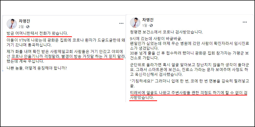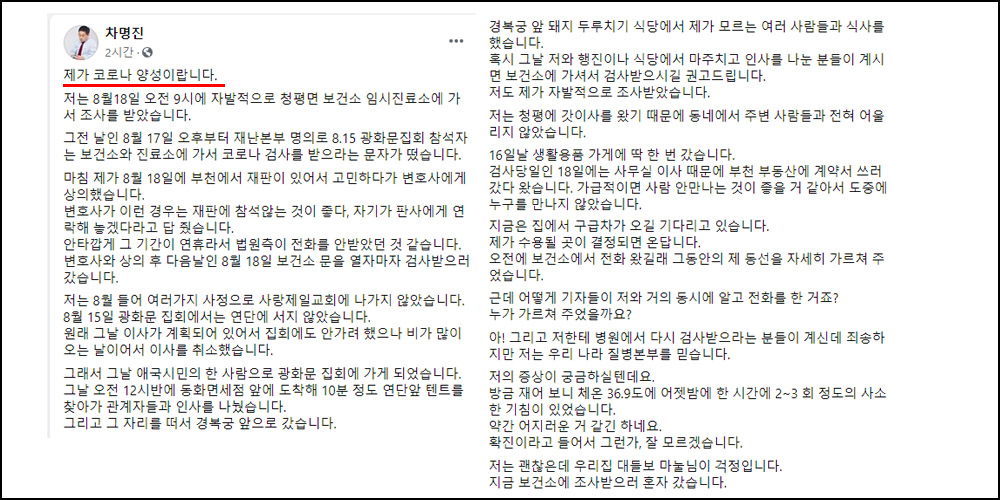 차명진 의원은 자신의 페이스북 계정을 통해 광화문 집회 갔다 온 이후 청평면 보건소에서 코로나 검사를 받았으며 TV에 얼굴도 나왔고 주변 사람들이 광화문 집회로 인해 걱정도 하기에 검사를 받았다고 밝혔습니다.