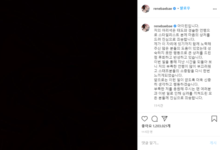 해당 게시글을 본인의 인스타그램에 직접 올린 상태이며, SM엔터테인먼트 또한 공식 입장을 통해서 "아이린은 오늘 오후 해달 스타일리스트와 직접 만나, 경솔한 태도와 감정적인 언행으로 깊은 상처를 드린 점에 대해 진심으로 사과했다"며 "성숙하지 못한 모습으로 많은 분께 심려를 끼쳐 죄송한 마음"이라고 밝혔습니다.